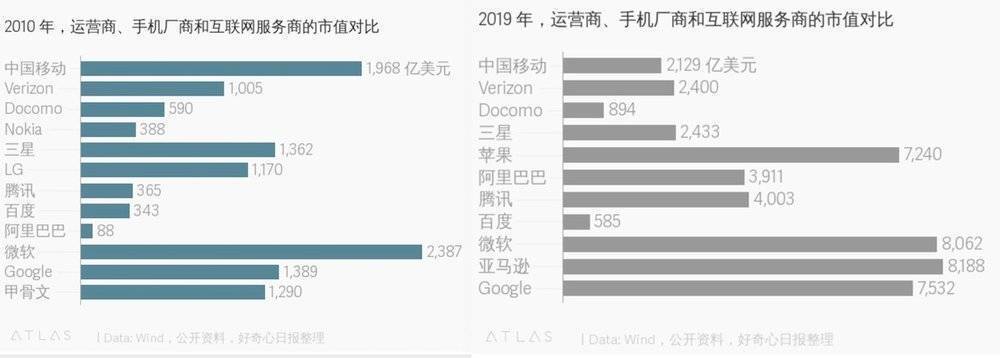 移動通信產業本來就是一條很巨大的食物鏈,成份相當復雜,自智能手機出現后,整個移動產業鏈更出現大洗牌。從上圖可見,下游互聯網(Google)和手機終端產業(蘋果)都在輕松吃肉,而上游的運營商(中國移動)和網絡基礎設備產業(諾基亞)只能辛苦地啃骨頭。