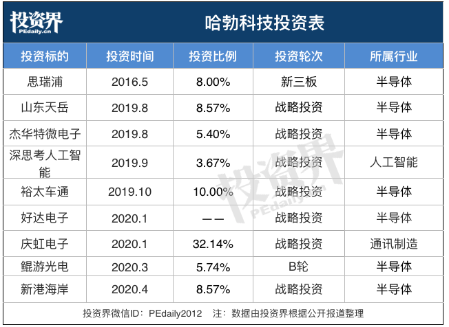 投資界根據公開的信息梳理,這一年來,哈勃投資相繼投資了9家企業。分別為:新港海岸(北京)科技有限公司、山東天岳先進材料科技有限公司、蘇州裕太車通電子科技有限公司、上海鯤游光電科技有限公司、深思考人工智能機器人科技(北京)有限公司、無錫市好達電子有限公司、杰華特微電子(杭州)有限公司、慶虹電子(蘇州)有限公司、思瑞浦微電子科技(蘇州)股份有限公司。