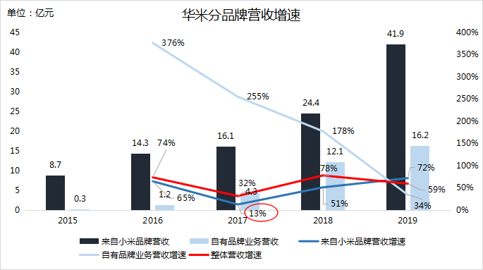 在招股書及年報(bào)中,華米會將營收按品牌來源劃分為來自小米品牌與來自自有品牌業(yè)務(wù)兩部分。