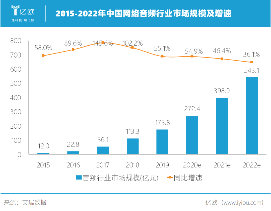 《中國網(wǎng)絡(luò)音頻行業(yè)研究報告》預(yù)計2020年網(wǎng)絡(luò)音頻行業(yè)市場規(guī)模達(dá)272.4億元,用戶規(guī)模將達(dá)5.42億。隨著在線音頻內(nèi)容的進(jìn)一步開放,以及用戶場景需求得到進(jìn)一步挖掘,市場有望保持穩(wěn)定快速增長態(tài)勢。